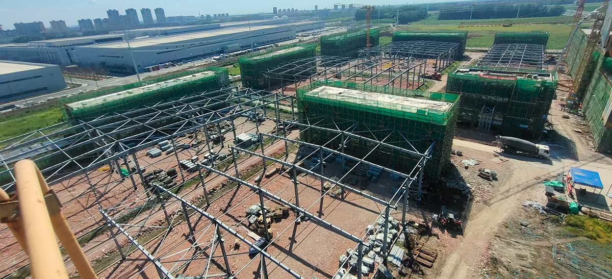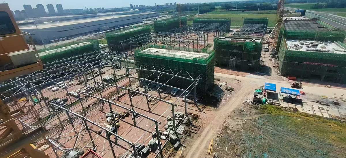 項(xiàng)目進(jìn)展:園區(qū)全部廠房已主體封頂。
